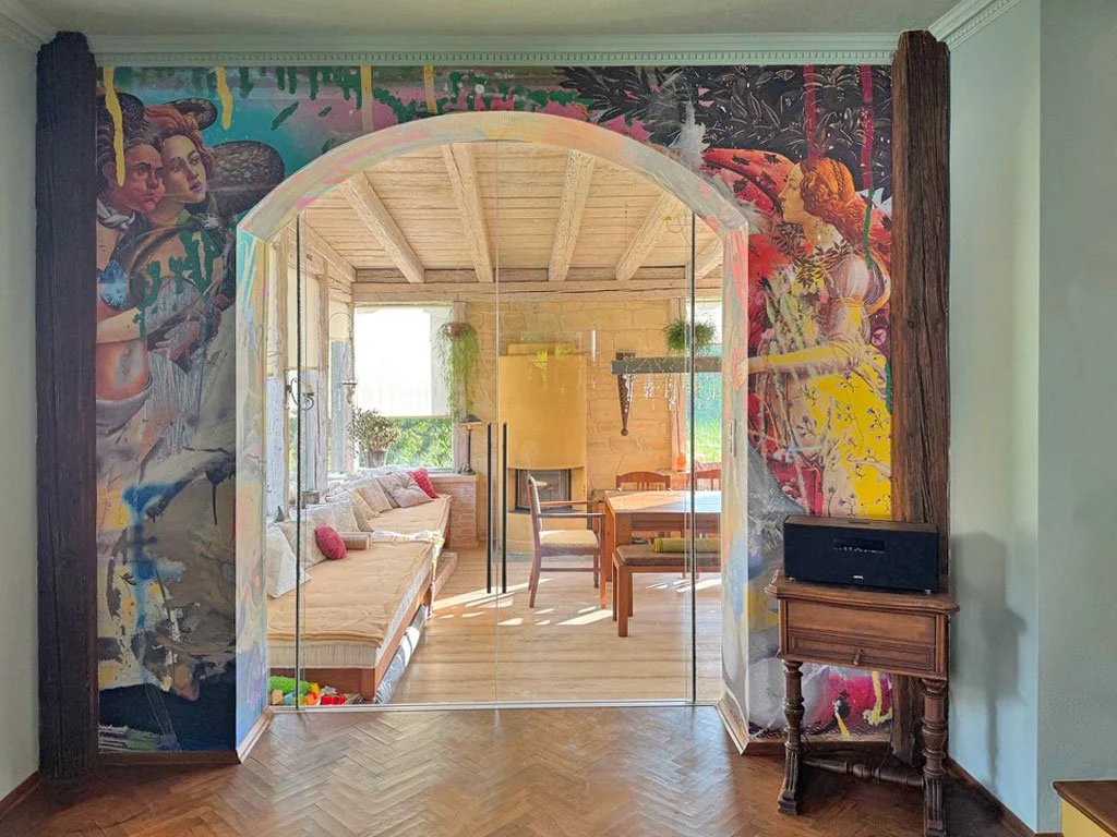 Another striking element in Konrad's reworking is the sofa, which appears as a static, cumbersome piece of furniture in the original painting. In Konrad's version, it transforms into a shape resembling a gymnastic hoop. This image suggests a dynamism and a certain freedom that allows the viewer to recognize the connection to the idea of a new beginning. The sofa, once a sign of stability and retreat, becomes a symbol of movement and change. Here, the artificiality of the object world supplants the static nature of the original, highlighting a contrast between stagnation and movement.