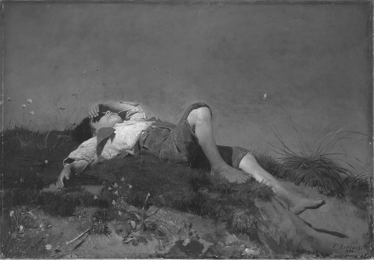 Franz von Lenbach schuf mit "Hirtenknabe" ein idyllisches Porträt eines jungen Hirten, das die naive Unschuld und die Einfachheit des ländlichen Lebens verkörpert. In der Darstellung steht der Junge für eine unbeschwerte Kindheit, weit entfernt vom hektischen Treiben der städtischen Gesellschaft. Lenbachs Verwendung von Licht und Schatten sowie seine geschickte Farbpalette verleihen dem Werk eine harmonische Grundstimmung. Der Hirtenknabe sitzt entspannt im Gras und scheint in seinen Gedanken versunken, ein Zustand der Ruhe und Abgeschiedenheit.